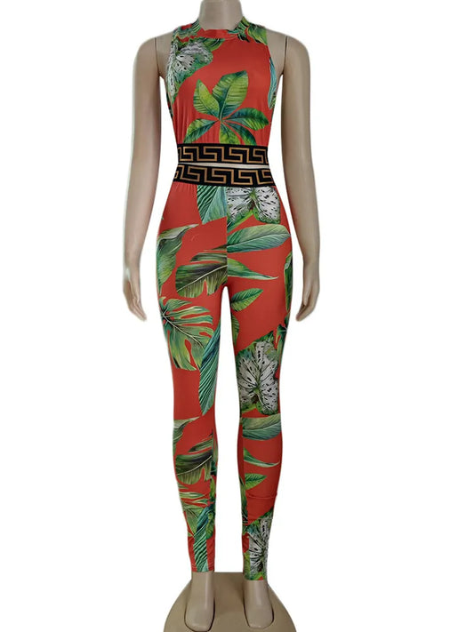 Kricesseen Sexy Print Leaves Skinny Two Pieces Pant Set New Women Sleeveless Tank Top And Leggings Suit Sportwear Matching Set