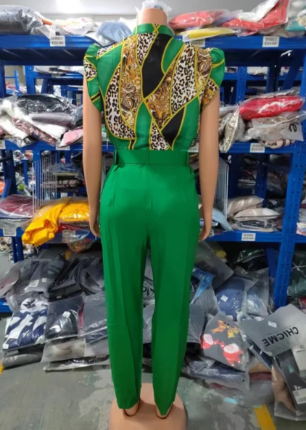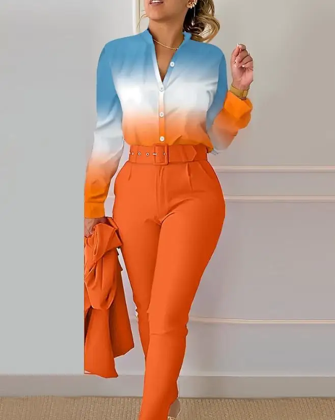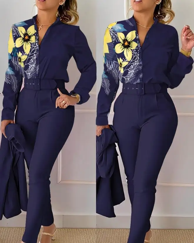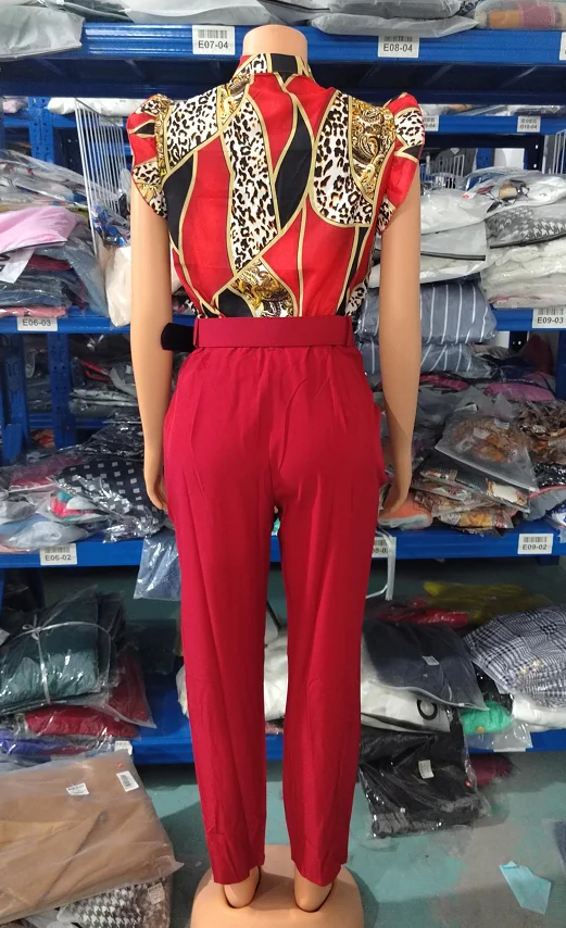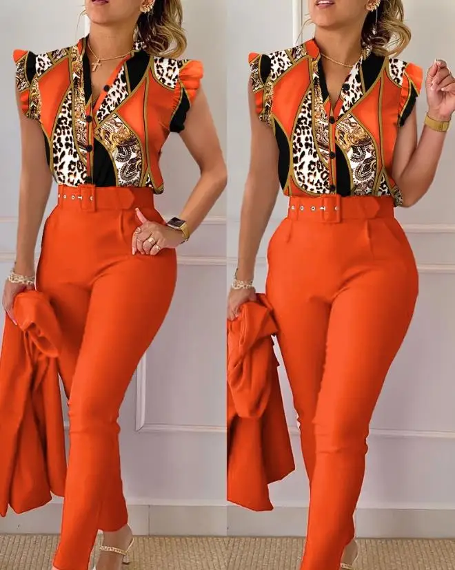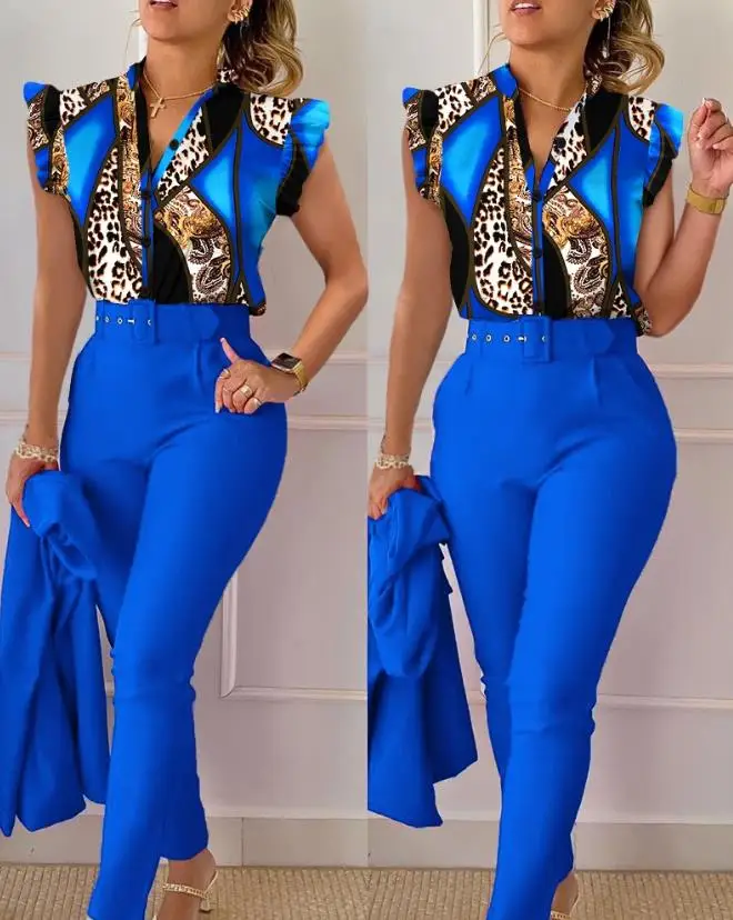 Women's Pant Set 2023 Summer Fashion Geometric Print Ruffle Sleeve Top and Pants Set with Belt Elegant Office Suit